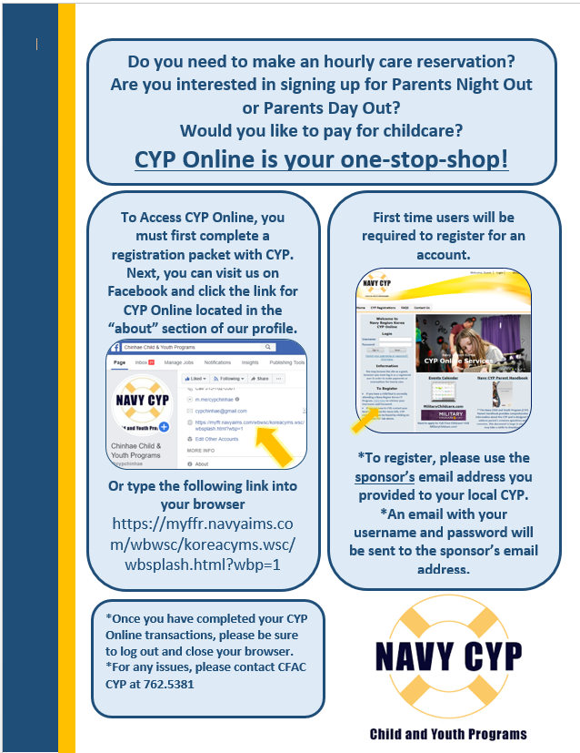 To request enrollment for Full and Part Time care families must use the www.MilitaryChildCare.com website. Hourly Care availability as well as payment options are all available online! After completion of the CYP registration families may utilize this service. Please visit https://myffr.navyaims.com/wbwsc/koreacyms.wsc/wbsplash.html?wbp=1